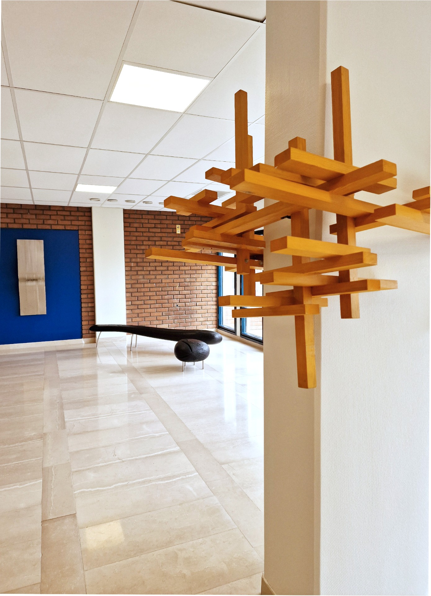 The new piece 'I Sing the Body Electric' by Per Brandstedt 2024 has been added to existing work (Ernst Nordin, Åke Lagerborg)in one of the many spaces along Gatan, the main corridor of the hospital. Selected walls along the route were painted blue, yellow or green to realign with the original ideas of the 1970s.